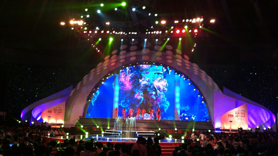 Sân khấu "nhà hát đĩa bay" với hàng nghìn chỗ ngồi gần kín khán giả.