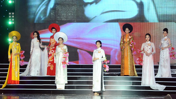 20h45: Phần thi áo dài chính thức bắt đầu. Hình ảnh người thiếu nữa trong chiếc áo dài đã trở thành hình ảnh đẹp đầy chất thơ. 39 cô gái bước đi duyên dáng trong tà áo dài và không quên mỉm cười chào khán giả.